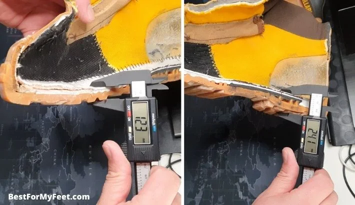 At the forefoot area, it’s about 12mm thick and 24mm thick at the heel area.