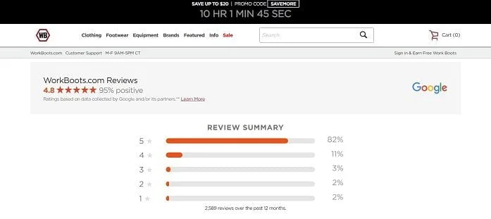 If you check out the WorkBoots.com reviews on THEIR OWN site, you’ll see you have 95% positive feedback based on data collected by Google and or its partners.