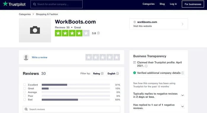 On TrustPilot [4] for example, WorkBoots.com has 30 reviews with a mix of great, excellent, and bad feedback. They have an average of 3.8 out of 5 stars.